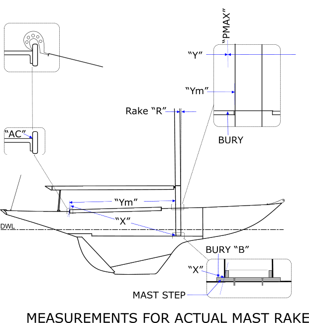 Note: The actual rake of the mast depends on the mast step position and how the mast is set in the deck partners. Potential rake assumes the mast is at PMax (which can be at or behind the aft edge of the partners). Potential rake is limited by Rule IV 5.11 to maximum of 2.00°.